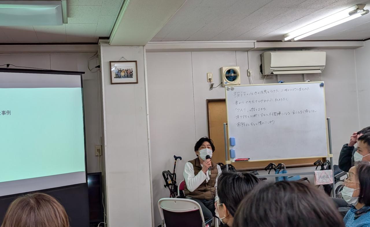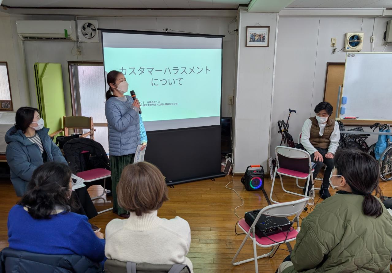2月は、「カスタマーハラスメントについて」というテーマで研修しました。今回の講師は内田高明統括責任者、小林さおり主任介護支援専門員、上遠野和サービス提供責任者の異色コラボ。